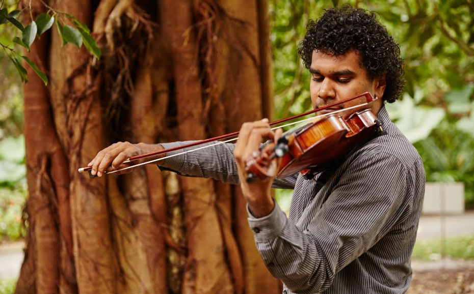 Eric Avery, Kabi Marrawuy Mumbulla, is a violinist, vocalist, dancer and composer from the Ngiyampaa, Yuin and Gumbangirr people of NSW. He works with his family’s custodial songs and his haunting compositions often feature him singing while playing violin, predominantly in the Ngiyampaa language.